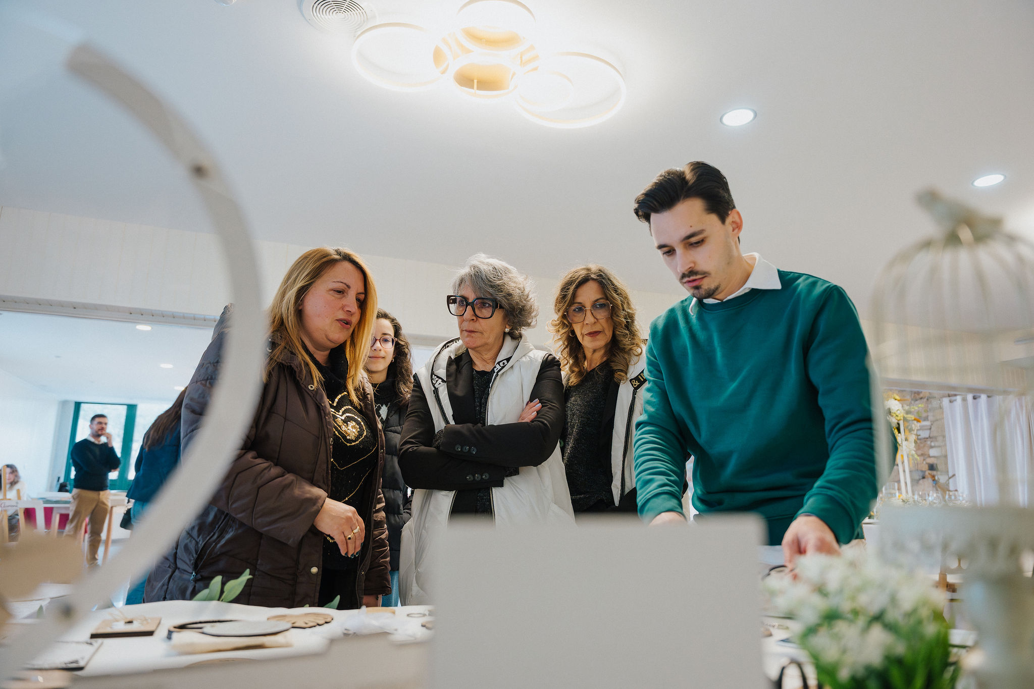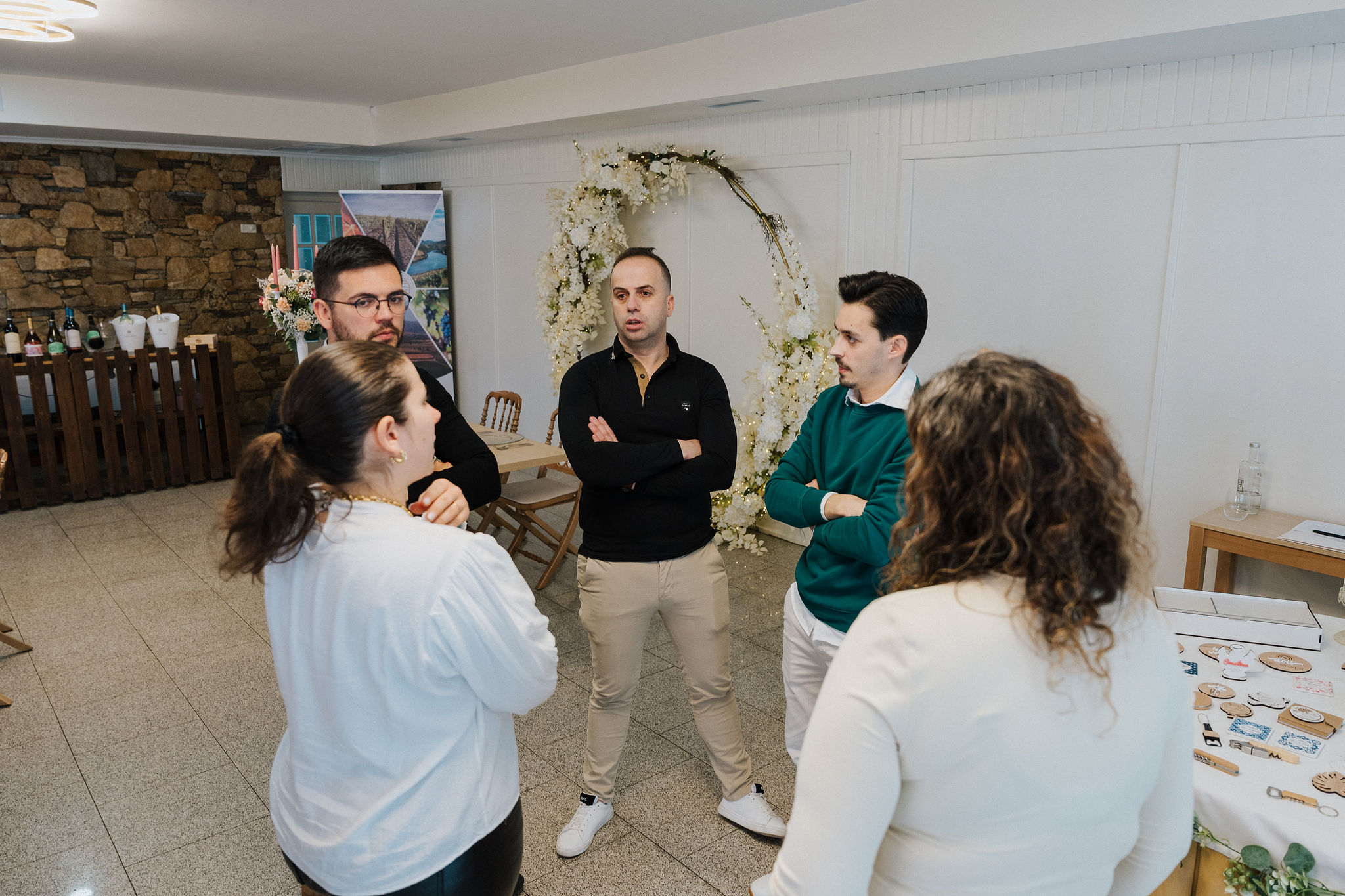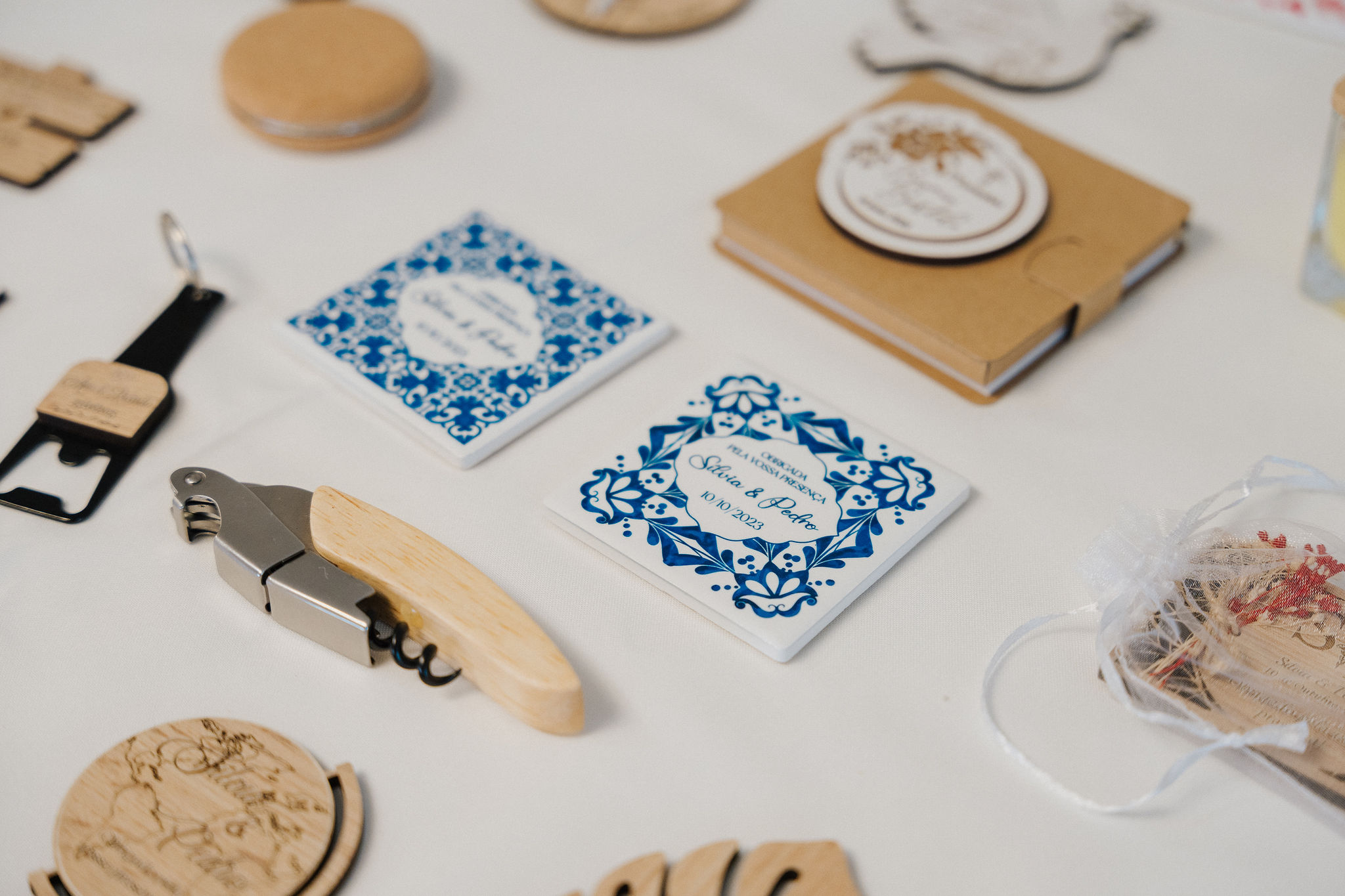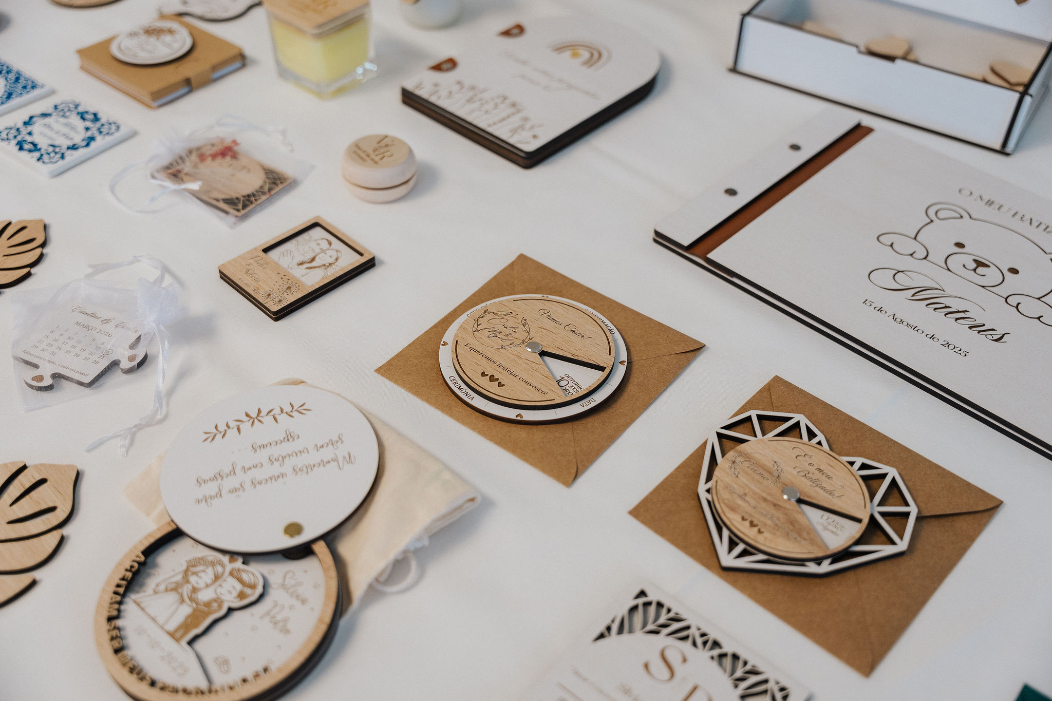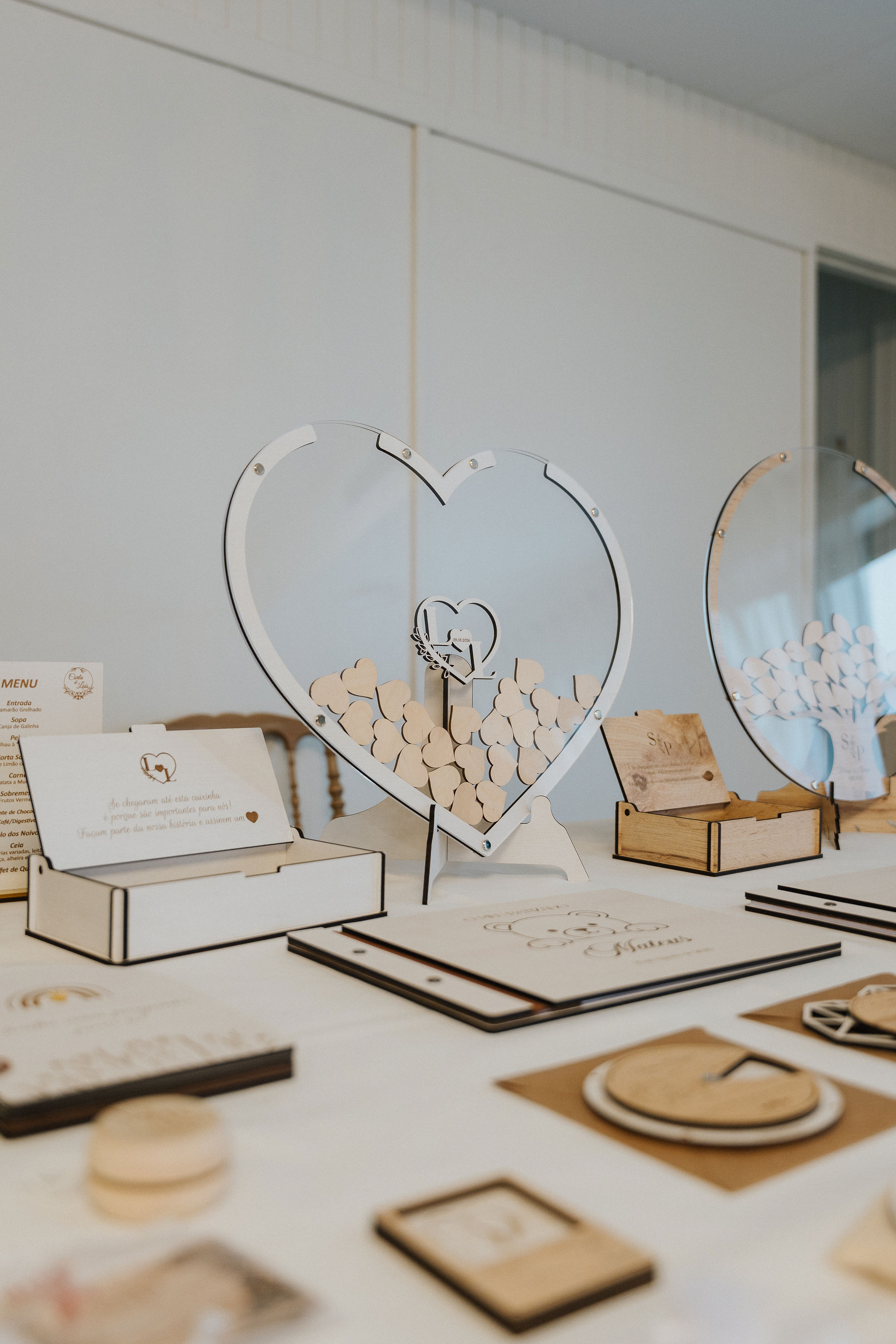 Embora o processo de orçamento e personalização possa começar online, eventos presenciais como este showroom permitem criar uma ligação mais próxima e humana. Explicar os processos de gravação a laser, apresentar materiais como madeira e acrílico e demonstrar exemplos reais ajuda os casais a sentir confiança nas escolhas que fazem para o seu grande dia.