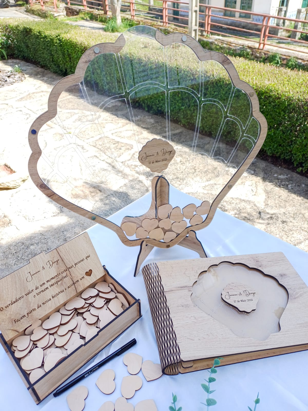 📖 Livros de Honra e Quadros de Assinaturas: Uma forma encantadora de guardar mensagens e votos dos teus convidados. Podes optar por estilos clássicos ou modernos, e combinar com o tema da cerimónia.